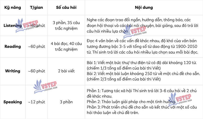 Để thi thử hiệu quả, bạn cần hiểu rõ cấu trúc từng phần trong đề thi VSTEP B1. Dưới đây là tóm tắt cấu trúc bài thi chuẩn do Bộ GD&ĐT ban hành