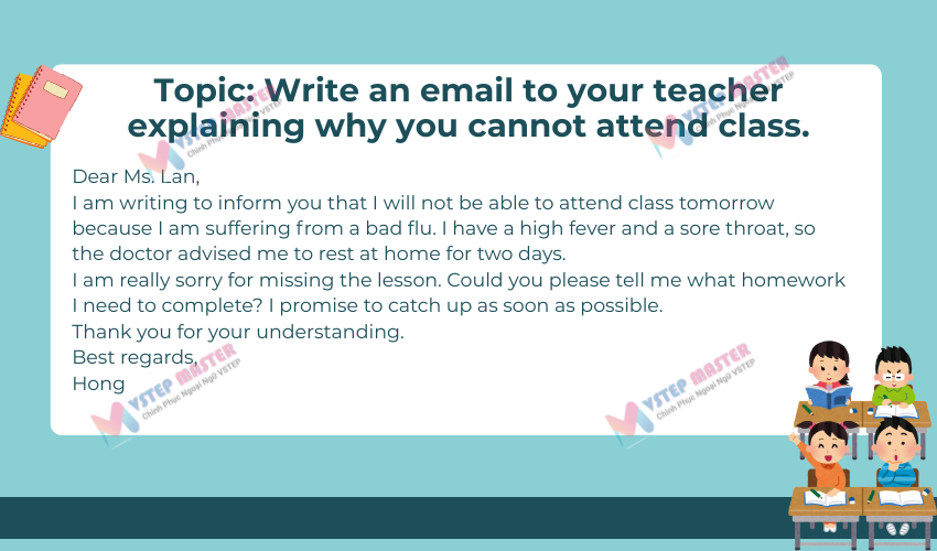 Chủ đề thường gặp: Xin nghỉ học / nghỉ làm ; Phản hồi thông tin; Hỏi lịch học / khóa học; Sắp xếp cuộc hẹn; Cảm ơn hoặc xin lỗi