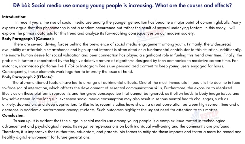 The aforementioned factors have led to a range of detrimental effects. One of the most immediate impacts is (hệ quả 1), which affects a large portion of the younger generation. Furthermore, (hệ quả 2) represents another grave consequence. In the long run, (topic/ chủ đề) may also result in (hệ quả 3). To illustrate, (ví dụ).