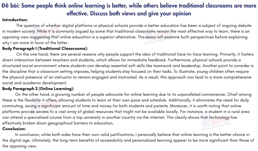 The question of (topic/ chủ đề) has been a subject of ongoing debate in modern society. While it is commonly argued by some that (quan điểm 1), there is an opposing view suggesting that (quan điểm 2). This essay will examine both perspectives before explaining why I am more in favor of the former/latter (chọn 1 hoặc 2).
