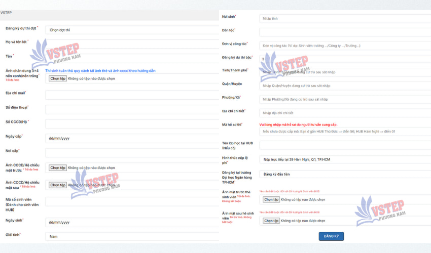 Giao diện đăng ký thi VSTEP online tại ĐH Ngân Hàng TP.HCM
