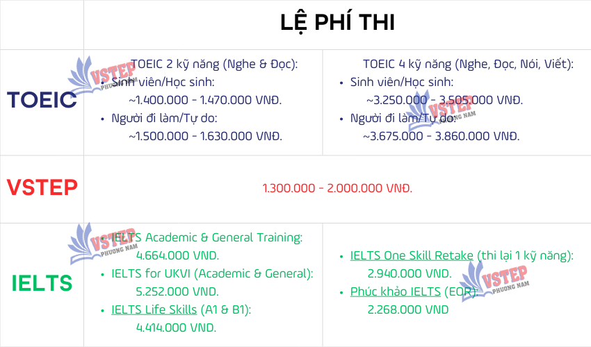 Lệ phí thi VSTEP, TOEIC, IELTS cập nhật năm 2026